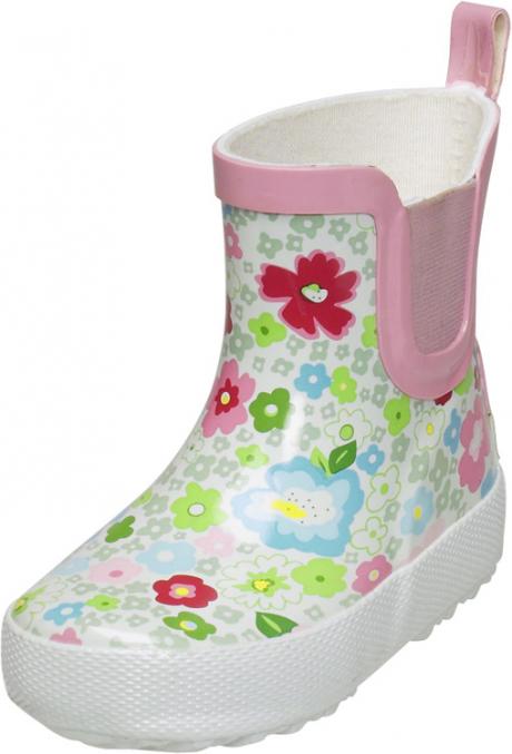 Trendiger Kurzschaft Gummistiefel mit Blumendesign. Aus Naturkautschuk und absolut wasserdicht. Dünnes Innenfutter aus Baumwoll-Jersey, mit herausnehmbarer Innensohle. Robuste Profilsohle. Für die Sicherheit bei Dämmerung sorgt ein Reflektorstreifen. Die Kinderfüsse bleiben bei Regen trocken und warm.